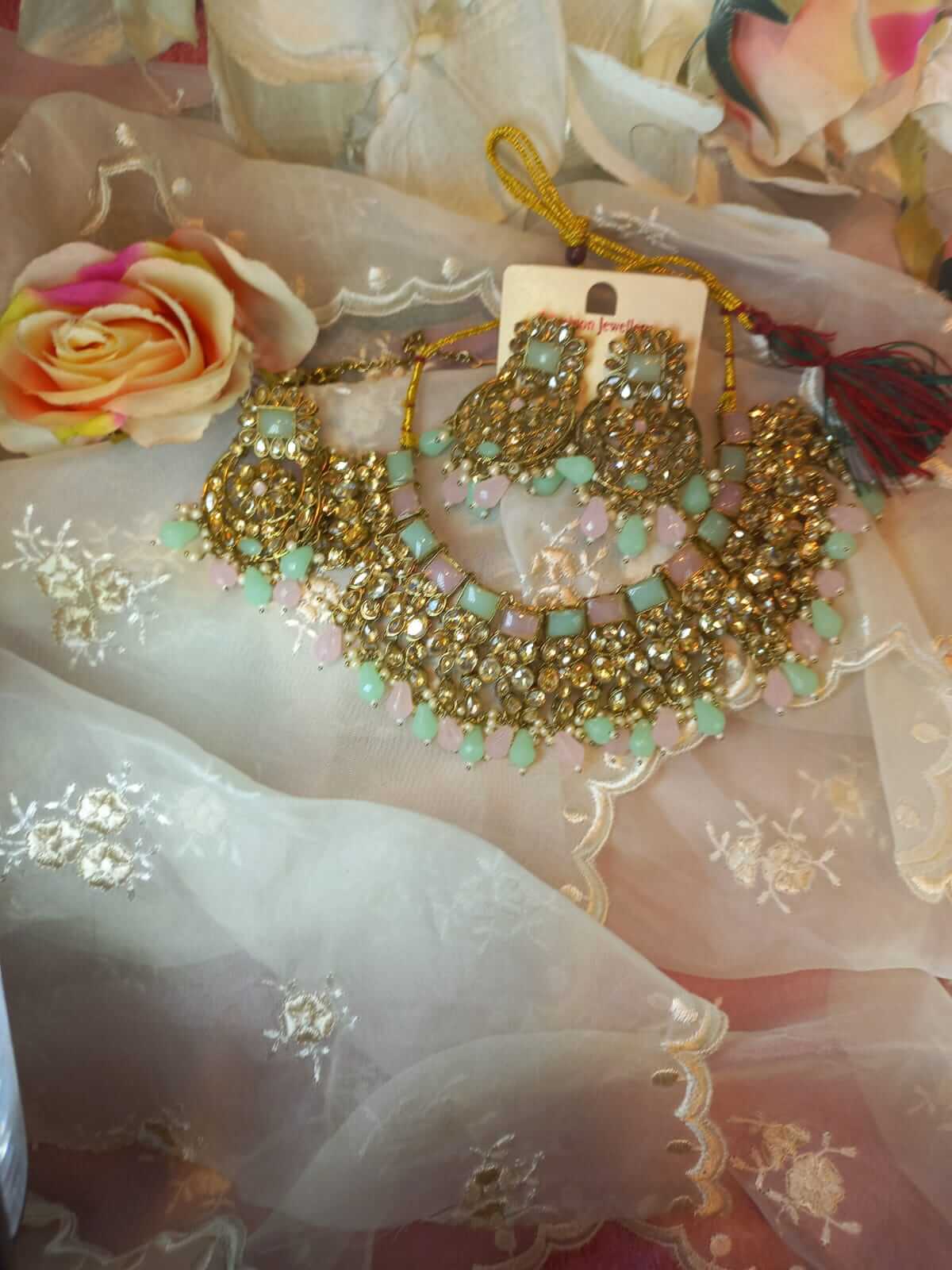 Crafted with care and attention to detail, each piece in our collection is designed to elevate your style and add a touch of luxury to any ensemble. Whether you’re attending a wedding, celebrating a special occasion, or simply looking to make a statement, our Light Mint and green choker setis the perfect accessory to complement your unique personality.